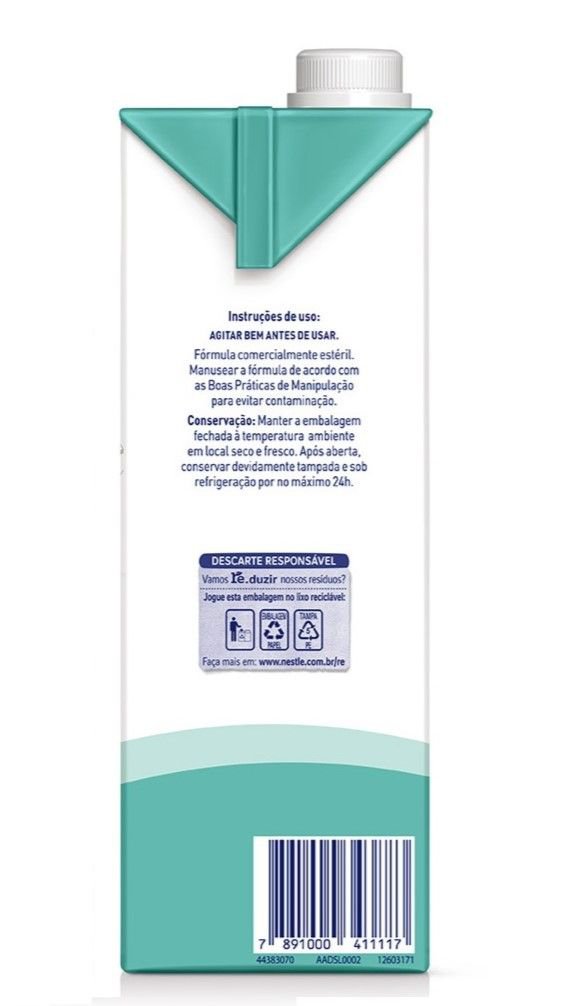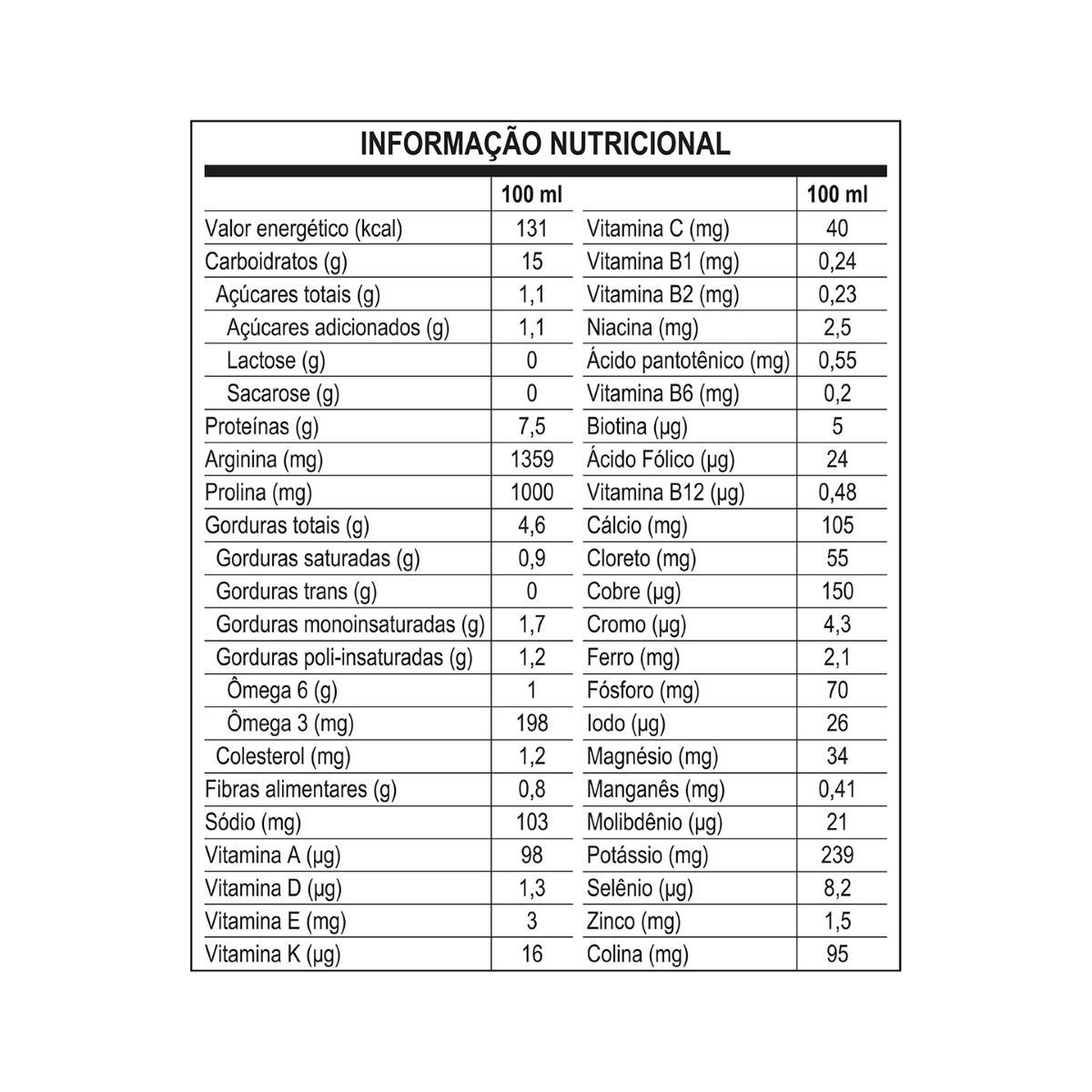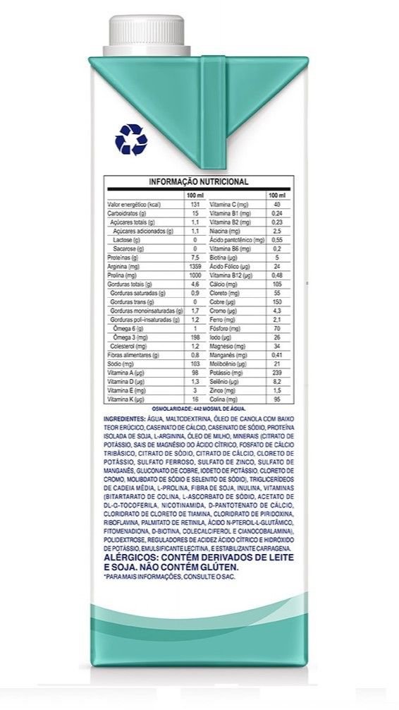 Ingredientes: Água, maltodextrina, óleo de canola com baixo teor erúcico, caseinato de cálcio, caseinato de sódio, proteína isolada de soja, L-Arginina, óleo de milho, minerais (citrato de potássio, sais de magnésio do ácido cítrico, fosfato de cálcio tribásico, citrato de sódio, citrato de cálcio, cloreto de potássio, sulfato ferroso, sulfato de zinco, sulfato de manganês, gluconato de cobre, iodeto de potássio, cloreto de cromo, molibdato de sódio e selenito de sódio), triglicerídeos de cadeia média, L-Prolina, fibra de soja, inulina, vitaminas (bitartarato de colina, L-ascorbato de sódio, acetato de DL-α-tocoferila, nicotinamida, D-pantotenato de cálcio, cloridrato de cloreto de tiamina, cloridrato de piridoxina, riboflavina, palmitato de retinila, ácido N-pteroil-L-glutâmico, fitomenadiona, D-biotina, colecalciferol e cianocobalamina), polidextrose, reguladores de acidez ácido cítrico e hidróxido de potássio, emulsificante lecitina de soja, e estabilizante carragena.