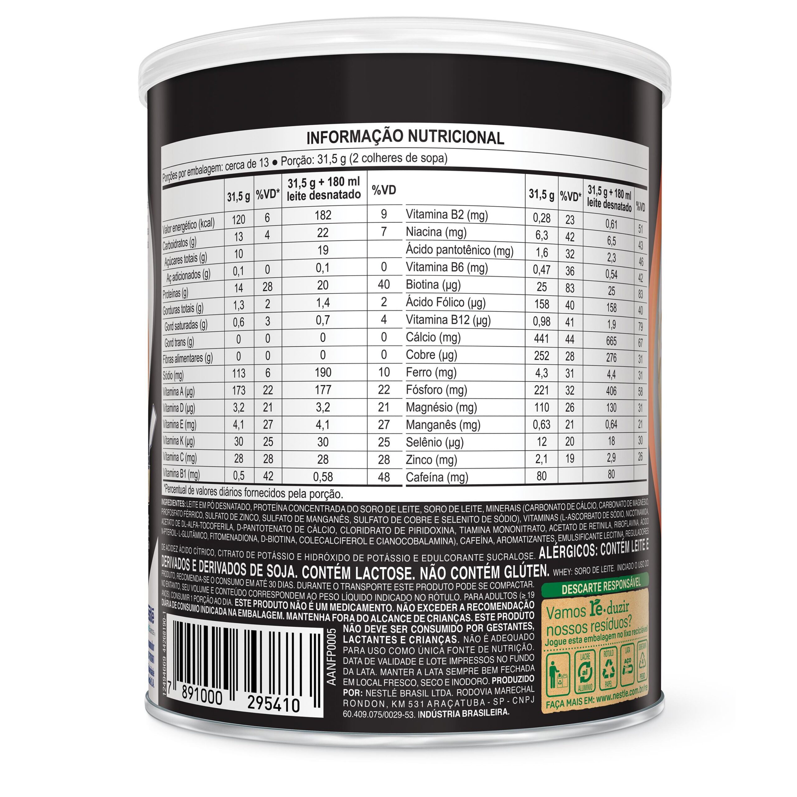 Ingredientes: Leite em pó desnatado, proteína concentrada do soro do leite, soro de leite, minerais (carbonato de cálcio, carbonato de magnésio, pirofosfato férrico, sulfato de zinco, sulfato de manganês, sulfato de cobre, selenito de sódio), vitaminas (L-ascorbato de sódio, nicotinamida, acetato de DL-alfa-tocoferila, D-pantotenato de cálcio, cloridrato de piridoxina, tiamina mononitrato, acetato de retinila, riboflavina, ácido N-pteroil-L-glutâmico, fitomenadiona, D-biotina, colecalciferol, cianocobalamina), cafeína, aromatizantes, reguladores de acidez ácido cítrico, citrato de potássio e hidróxido de potássio, emulsificante lecitina de soja e edulcorante sucralose.